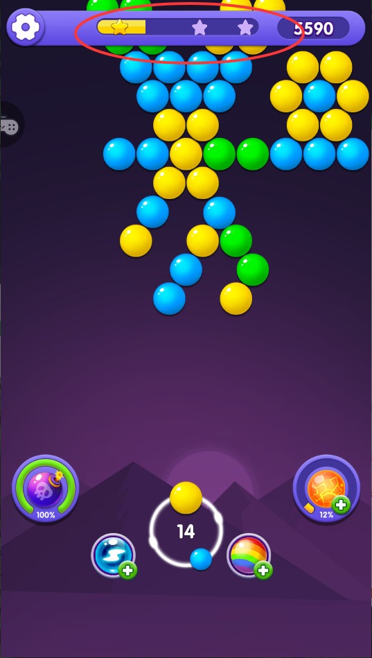 3、每关都有目标分数要求,消除越多泡泡得分越高,分数条满了就能过关,后面关卡会越来越难搞。