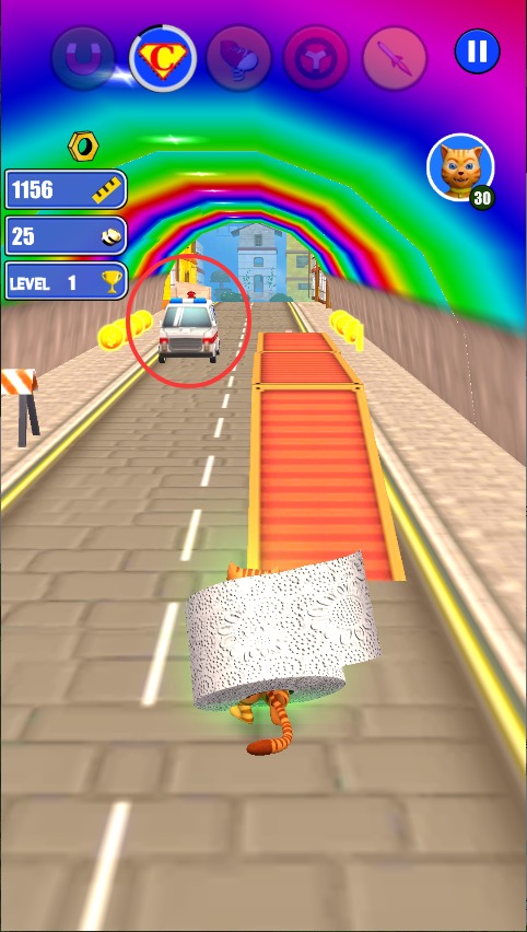 2、手指左右滑动屏幕控制猫咪移动,注意避开路上的障碍物,撞到东西就会把卫生纸缠住导致失败。