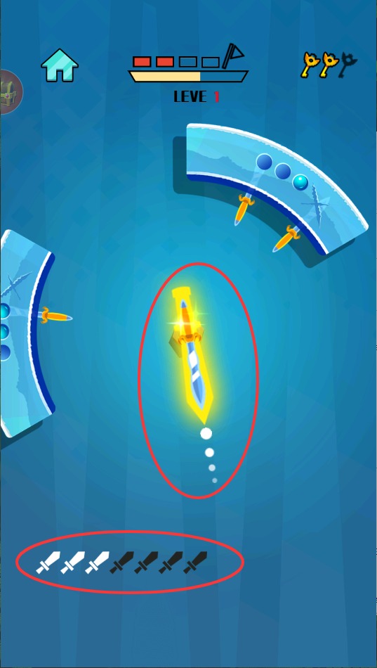 2、点击射击,触屏发射飞刀精准切割水果,注意屏幕下方显示剩余次数,合理分配每次投掷机会提高连击得分。