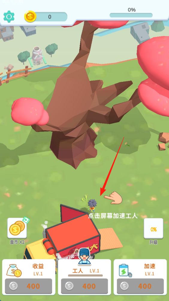 1、在游戏初始界面,依据“点击屏幕加速工人”提示,点击屏幕加快工人工作进度获取金币。
