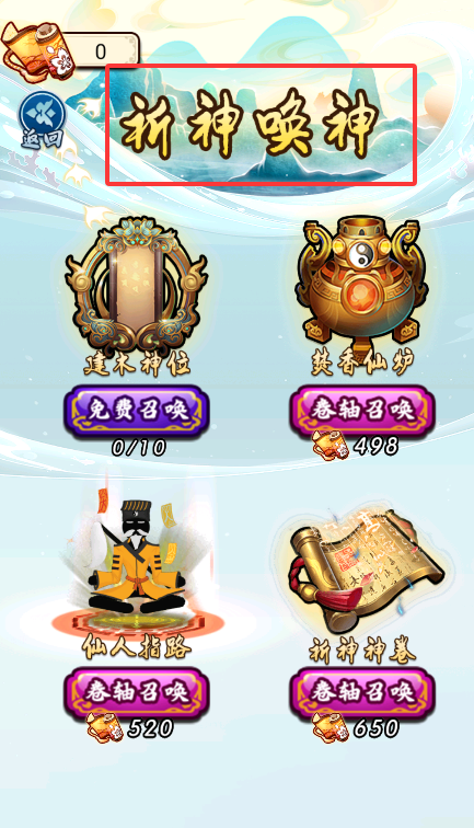 2、点击祈神召唤按钮可进行神灵召唤,每次召唤都有机会获得不同品质的仙灵伙伴。