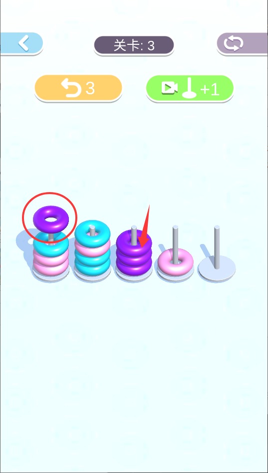 1、基础操作简明直观,点击选中圆环后再点击目标立柱即可完成转移。确保目标立柱有足够空间容纳新增圆环避免操作失误。