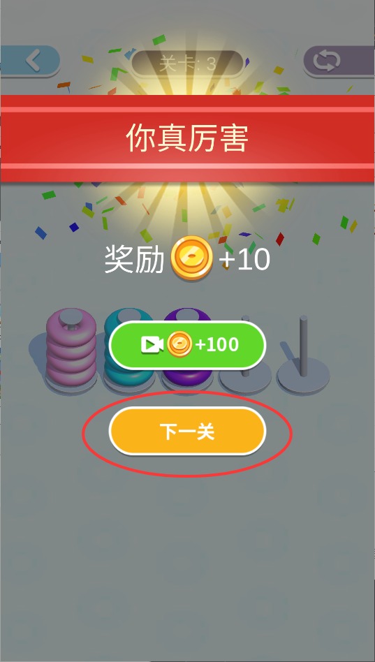3、当所有环圈清除完毕会触发通关动画,点击右下角闪烁的箭头即可进入难度提升的后续关卡。