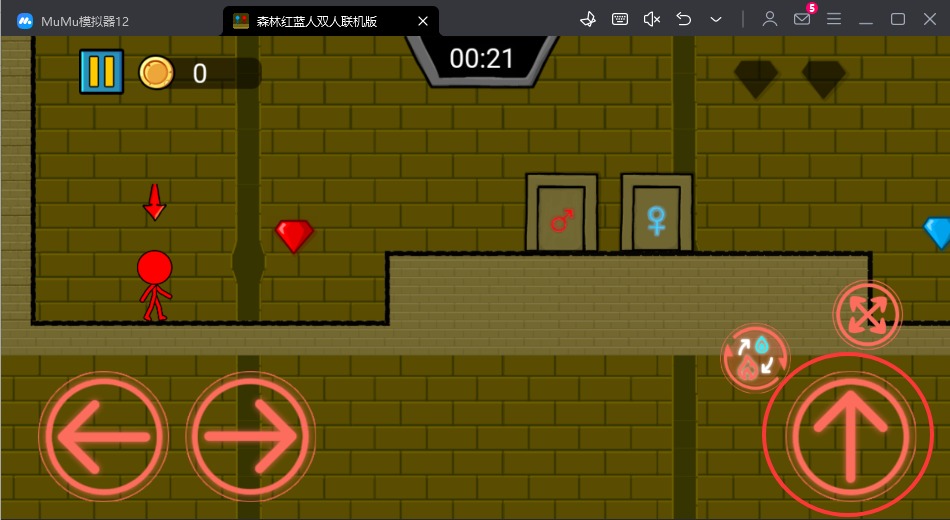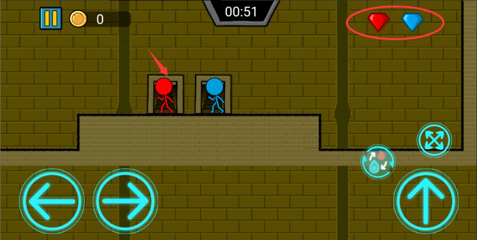 3、当红蓝角色共同收集足够数量的钻石后,协作开启终点大门,同时进入即可成功完成关卡挑战。