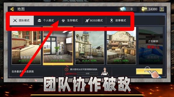 1.点击上方不同模式按钮,随时切换团队、个人、生存等多样玩法模式。