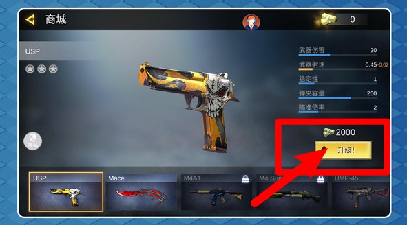 3.当金币足够时,点击右下“升级”按钮提升武器属性强化战力。