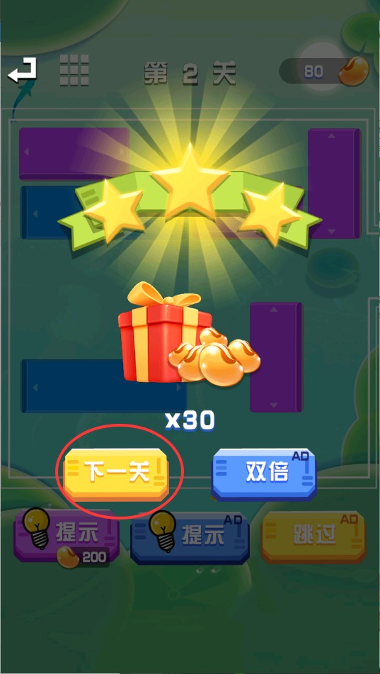 3、成功通关后点击屏幕中央的下一关按钮,即可解锁更具挑战性的全新关卡继续冒险。