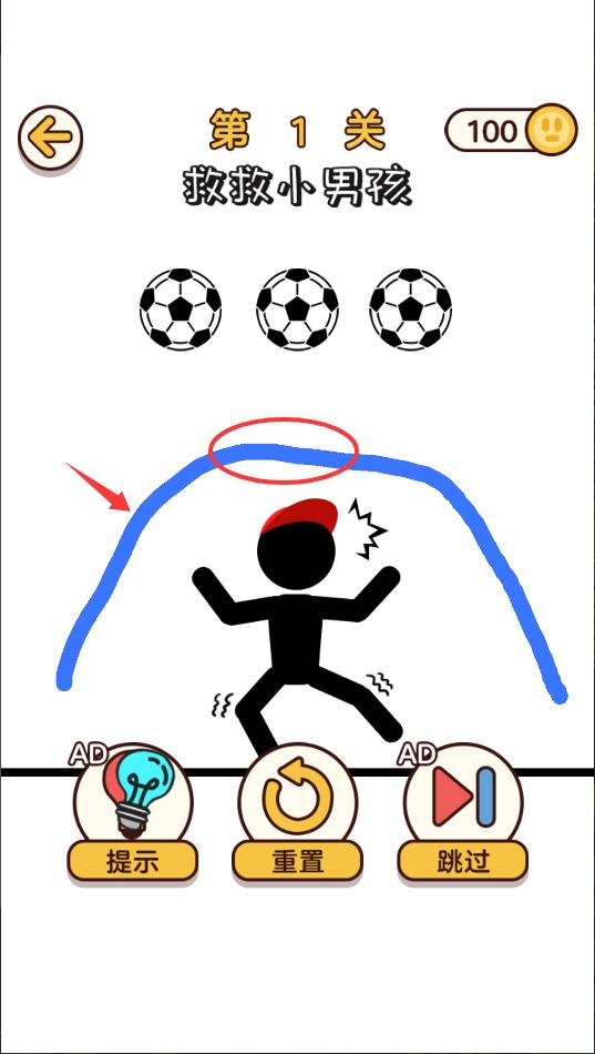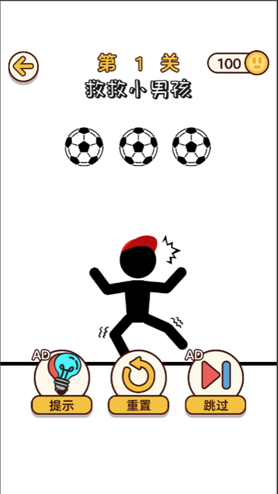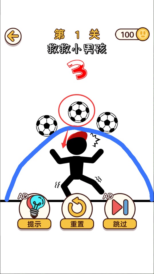 3、时刻注意球体运动轨迹,及时补充防护线,避免任何球体接触到火柴人即可通关。