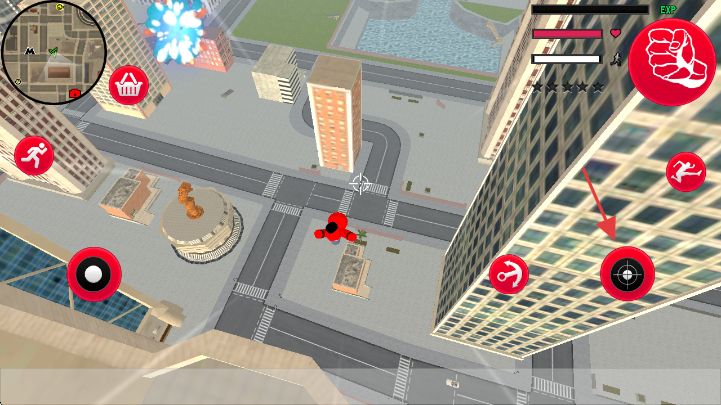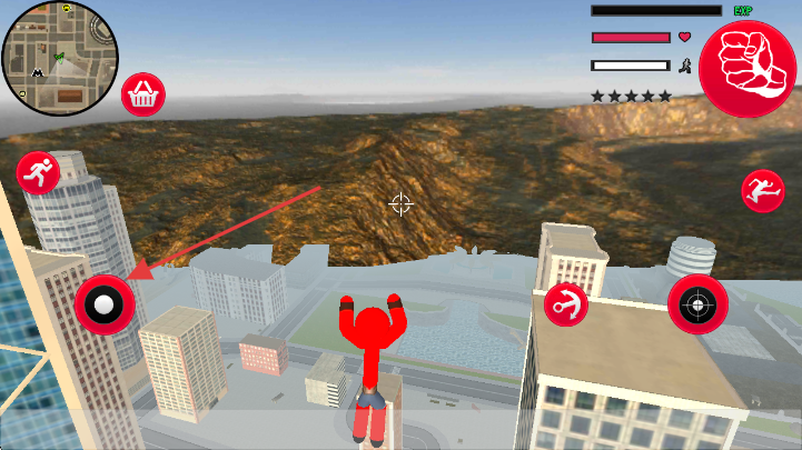 2、在城市场景中,利用左侧虚拟摇杆控制角色移动,可攀爬高楼,探索城市环境。