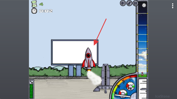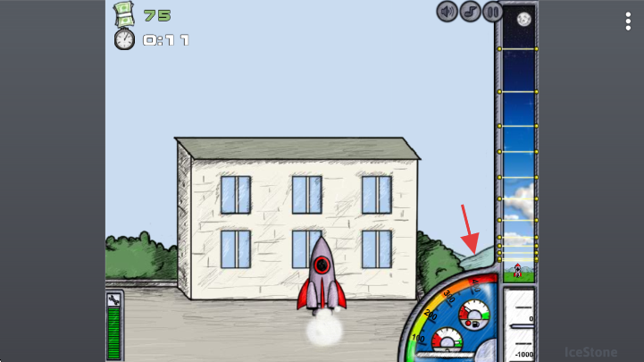 3、持续操控火箭,避开建筑物等,提升飞行高度,积累金钱,在时间限制内尽可能飞得更高。
