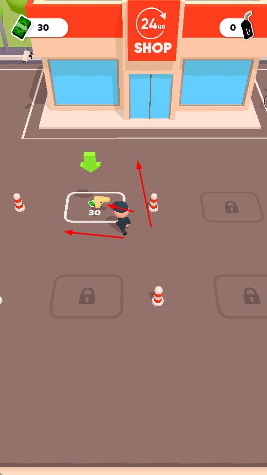 1、玩家操控角色在场景中移动,拾取地上类似钞票的资源,如从标有“30”“45”的区域收集,增加游戏内货币数量。