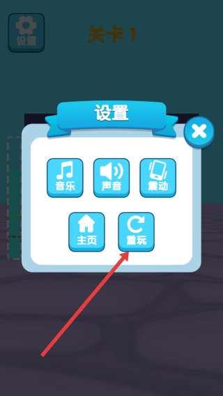 3、若需要重新开始当前关卡,按箭头指示,打开设置界面,点击“重玩”按钮,重新进行关卡挑战。