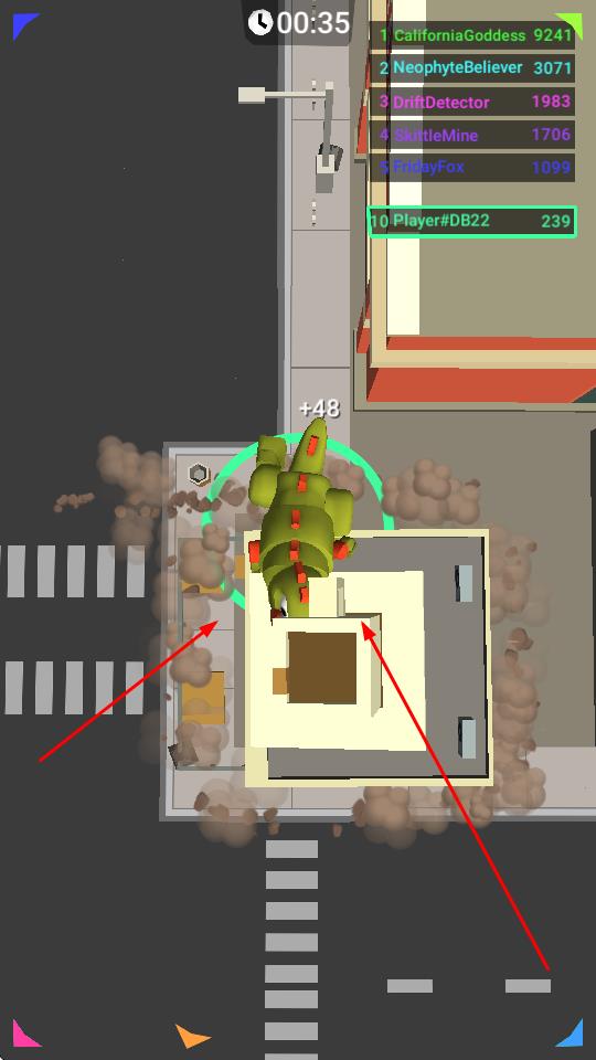 2、恐龙可破坏城市中的建筑物、设施等,破坏后能获取能量,屏幕会显示能量增加数值,积累能量用于自身成长。