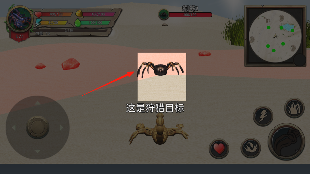 1、明确狩猎目标为“蜘蛛1”,其生命值为百分之百,玩家角色各项状态指标也在界面上方显示,可随时关注自身状态。