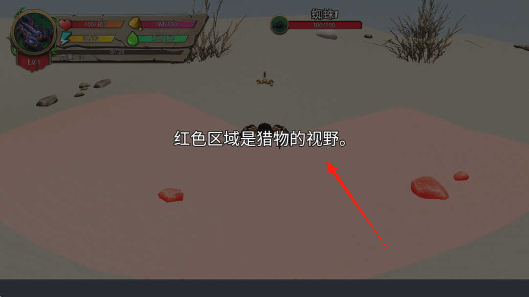 2、了解红色区域是猎物的视野范围,操控角色时要避免进入该区域被发现,利用视野外区域进行伏击。