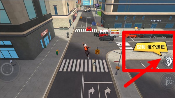 2.如图中所示,使用屏幕右侧的“控制按钮”可让角色在城市中自由移动和飞跃,灵活避开障碍并迅速接近敌人。