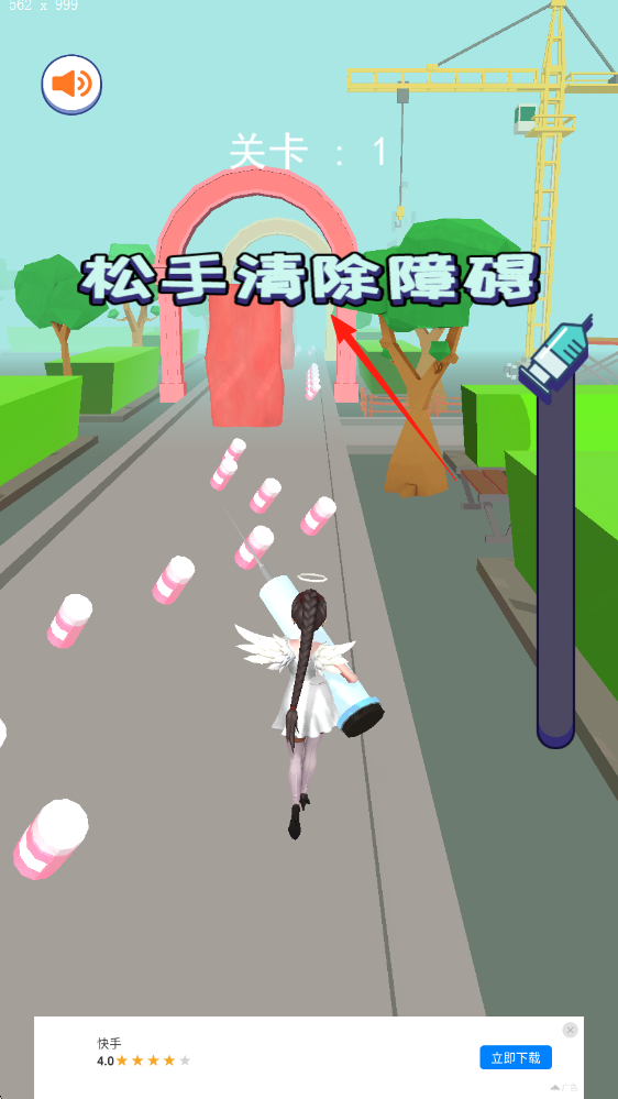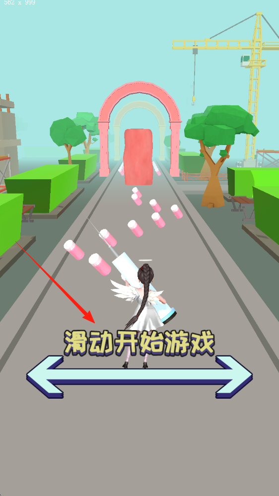 1、滑动屏幕上的箭头区域,让角色开始在道路上前行,收集粉色胶囊道具。