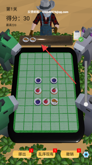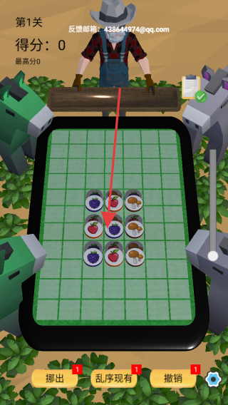 1、第1关,观察棋盘同色物品(如紫色葡萄),拖动使其横竖连成3个及以上,触发消除,得分并推进关卡。