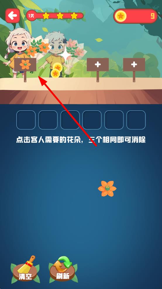 2、观察上方顾客需求的花朵样式,点击下方区域对应花朵,每凑齐三个相同花朵即可消除,满足顾客订单。