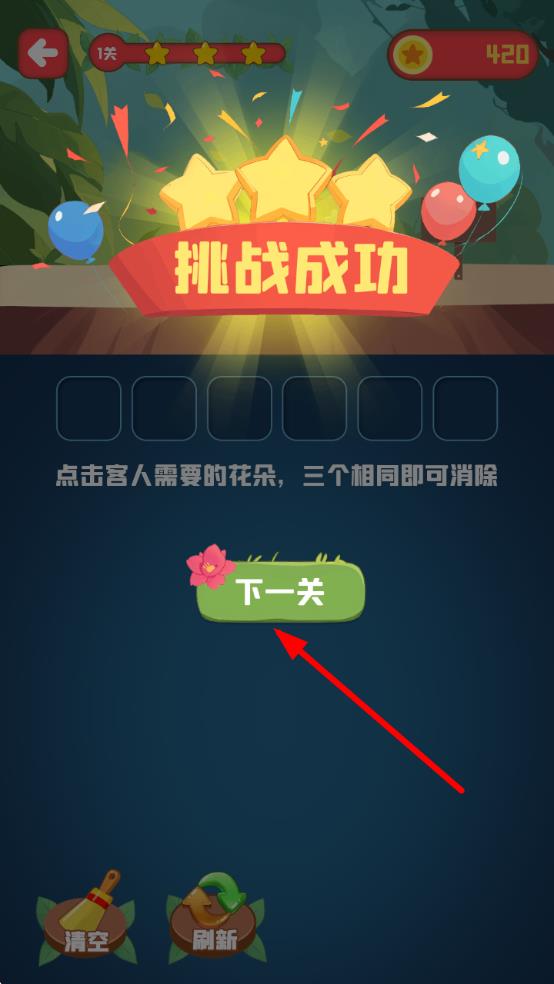 3、成功完成订单挑战后,点击“下一关”,解锁更复杂花朵布局、更多变顾客需求的新关卡,持续拓展消除乐趣。