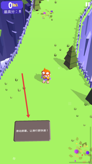 3、遵循“滑动屏幕加速”提示,滑动操作让角色在草地场景快速滑行,推进探索,解锁后续玩法。