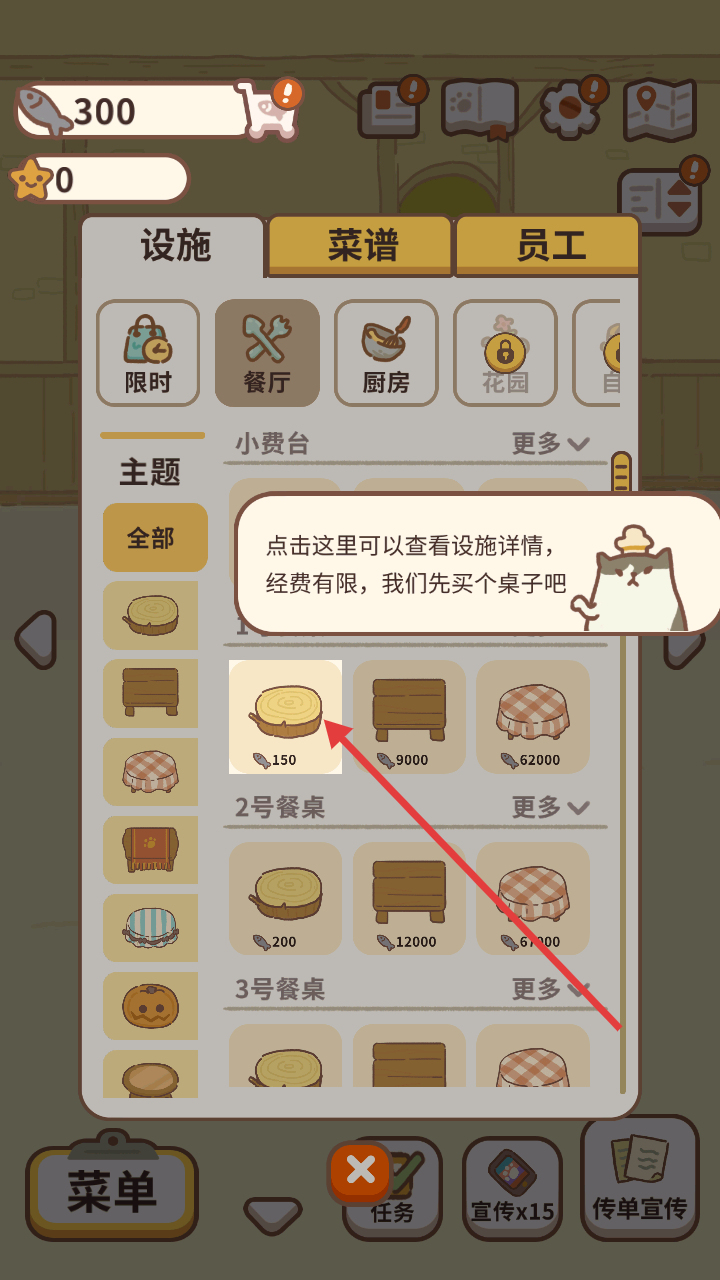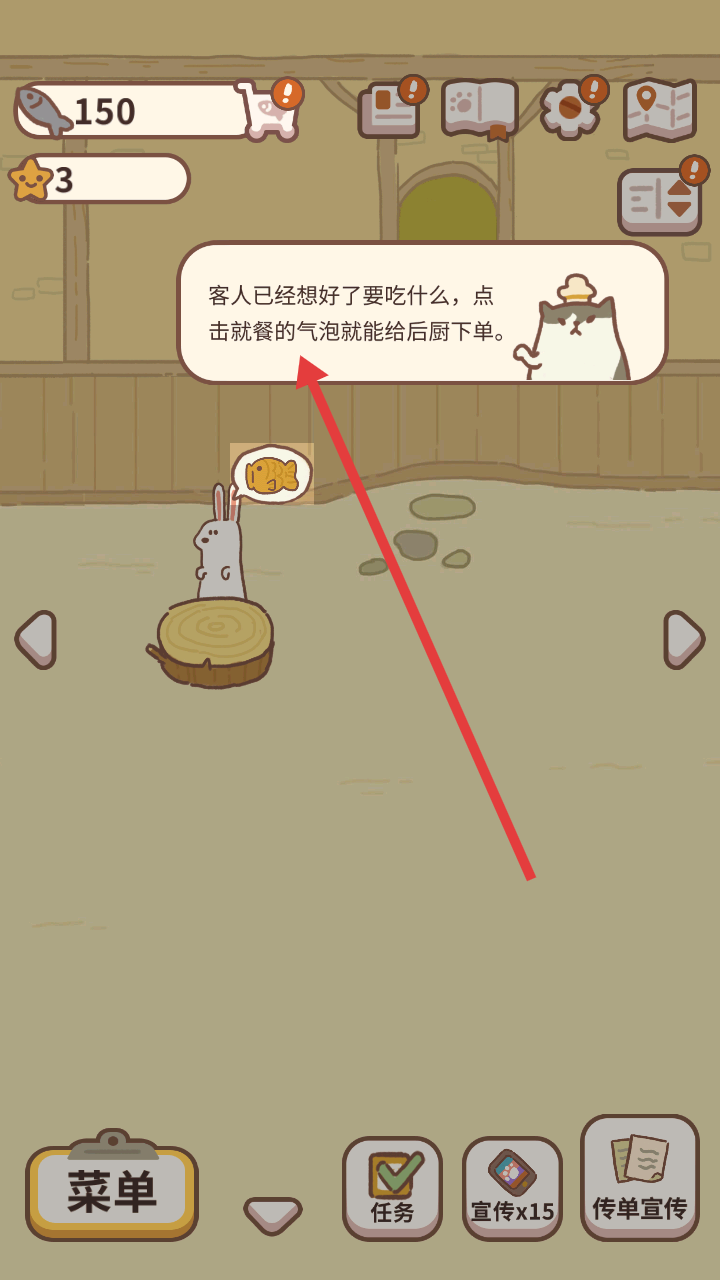 3、购买桌子后给客人点菜,根据游戏引导去后厨为客人做饭。