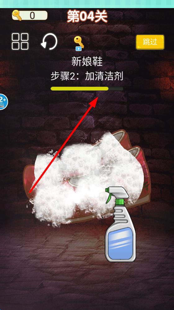 2、面对污渍类关卡,点击选择清洁工具,按顺序使用清洁剂、抹布、刷子等去除污垢,如用刮胡刀清理镜面泡沫、用洗鞋刷清洁运动鞋污渍。
