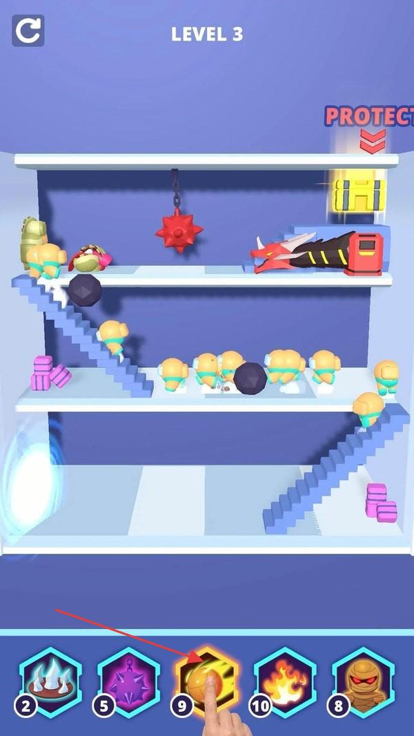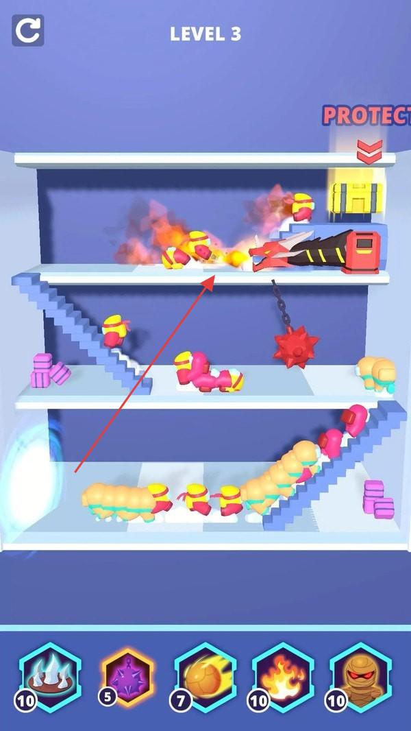 1、进入关卡(如LEVEL3),观察敌人路径、机关分布,点击底部技能(如橙色球技能)释放。