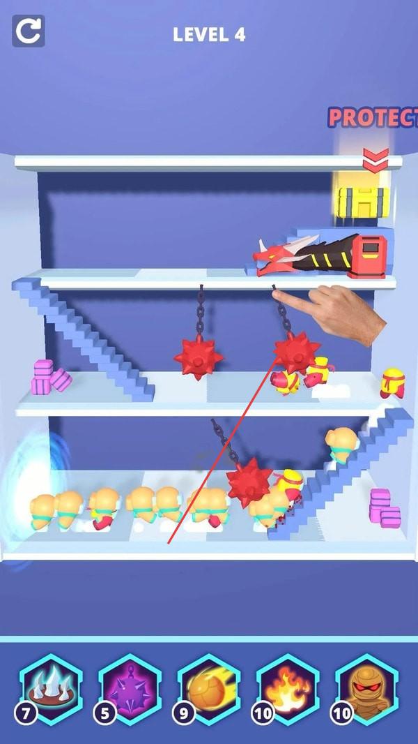 2、利用场景机关(流星锤),调整位置攻击敌人,阻止其到达终点,保护关键目标。