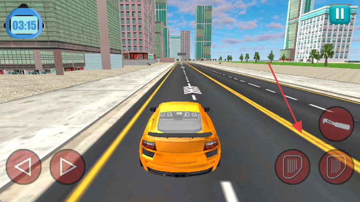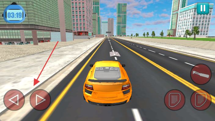 2、驾驶黄色汽车时,通过左侧带箭头的按钮(如红色箭头指向的右箭头),操控车辆转向,规划行驶路径。