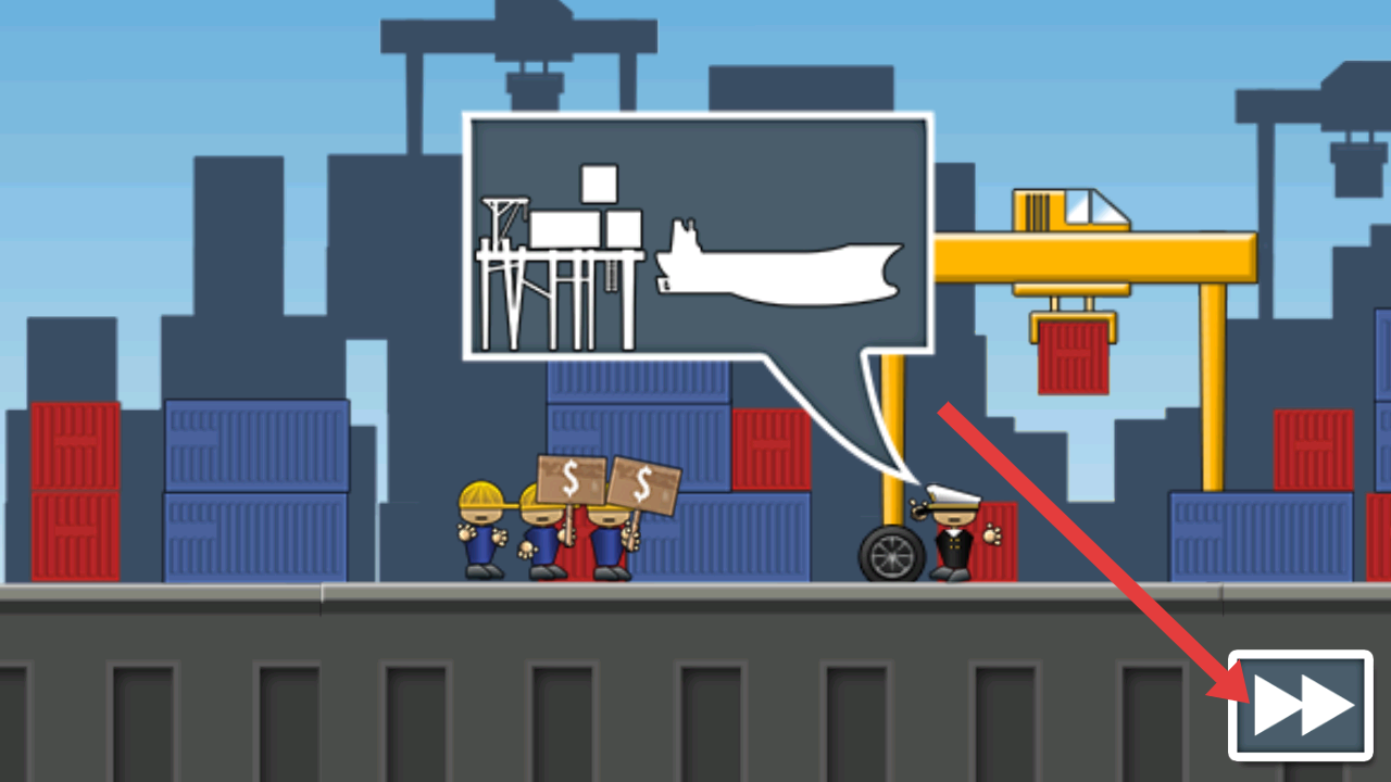 2、在运输货船的游戏教程场景,需要点击右下角的箭头图标,推进游戏的剧情以了解货运任务规则。