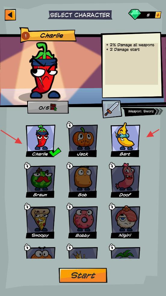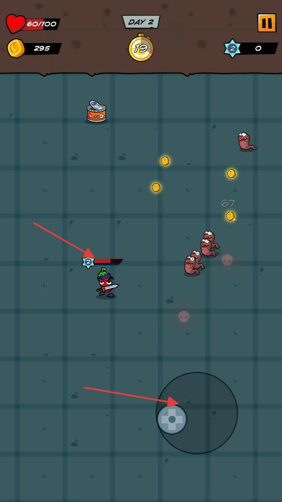 1、操控辣椒、香蕉等角色,在关卡地图移动,点击虚拟摇杆控制方向,遭遇虫子等敌人自动战斗,收集金币、道具。
