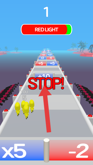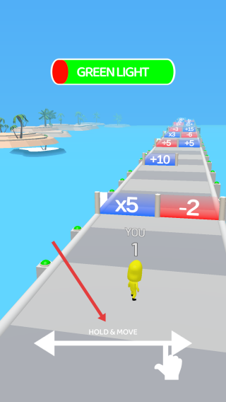 2、绿灯时,按住屏幕左右滑,收集×5、+10等道具,扩增角色。