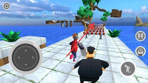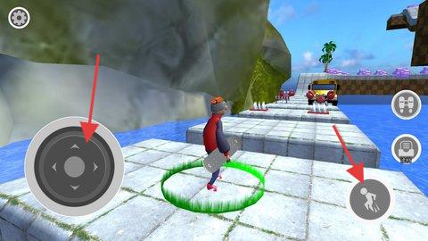 1、通过左侧虚拟摇杆,控制角色前后左右移动,在水上跑道、石板路等场景奔跑,躲避障碍。