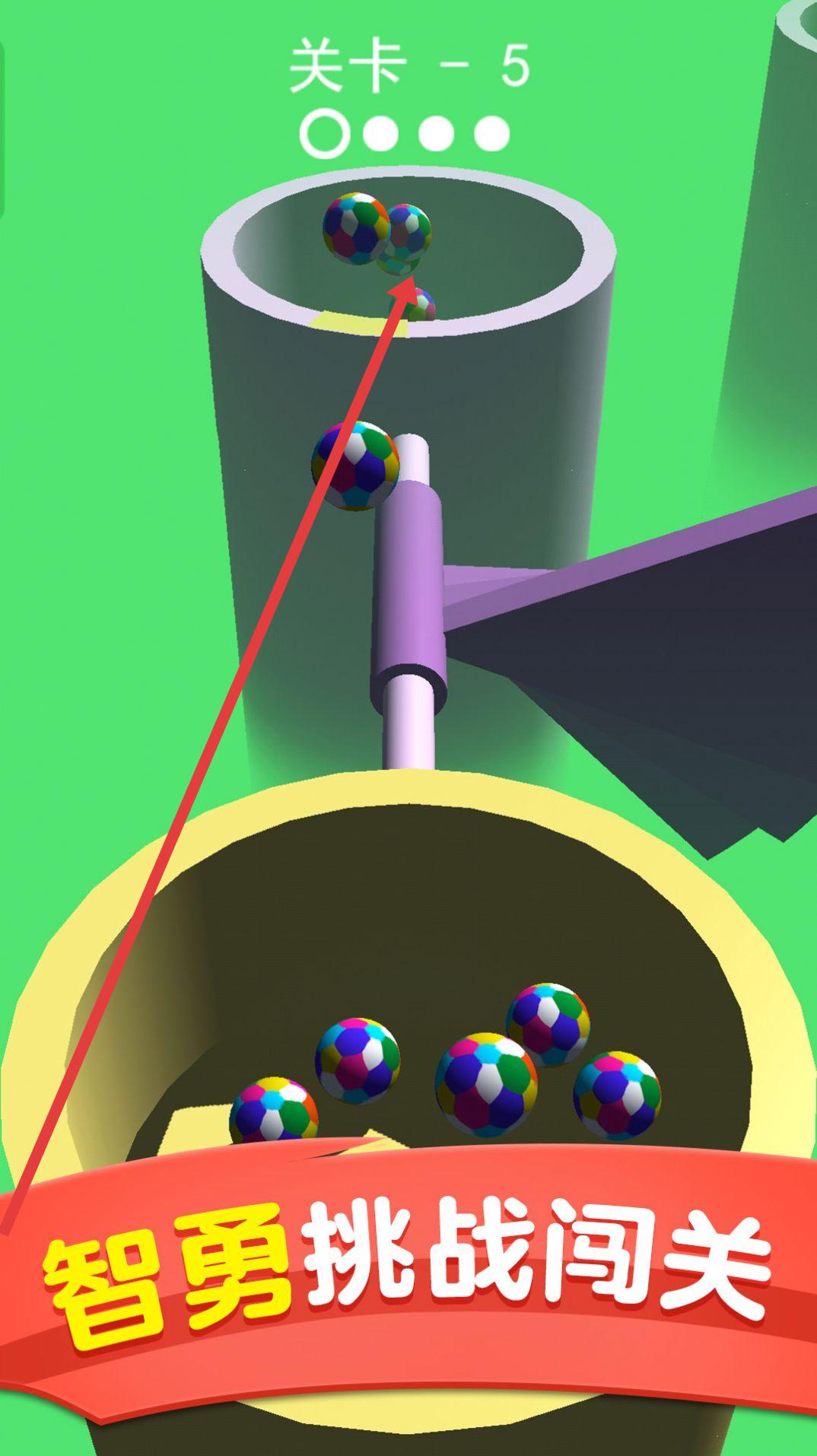 1、关卡-5,观察紫色装置移动规律,待通道无遮挡,释放彩球,让其沿箭头入上管道,完成【智勇挑战闯关】。