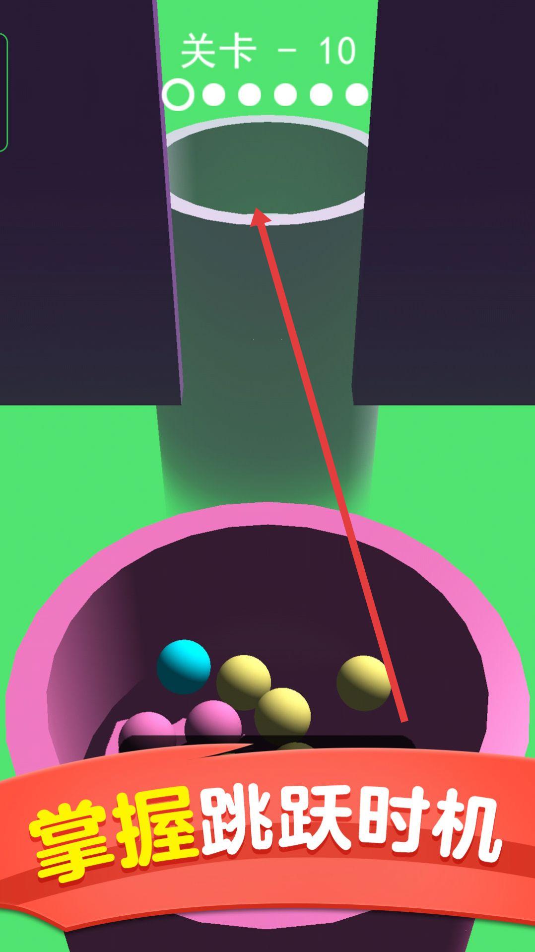 2、关卡-10,紧盯上方管道开口,当开口对齐,点击让彩球跳跃,把握【跳跃时机】,送球入管,推进关卡。