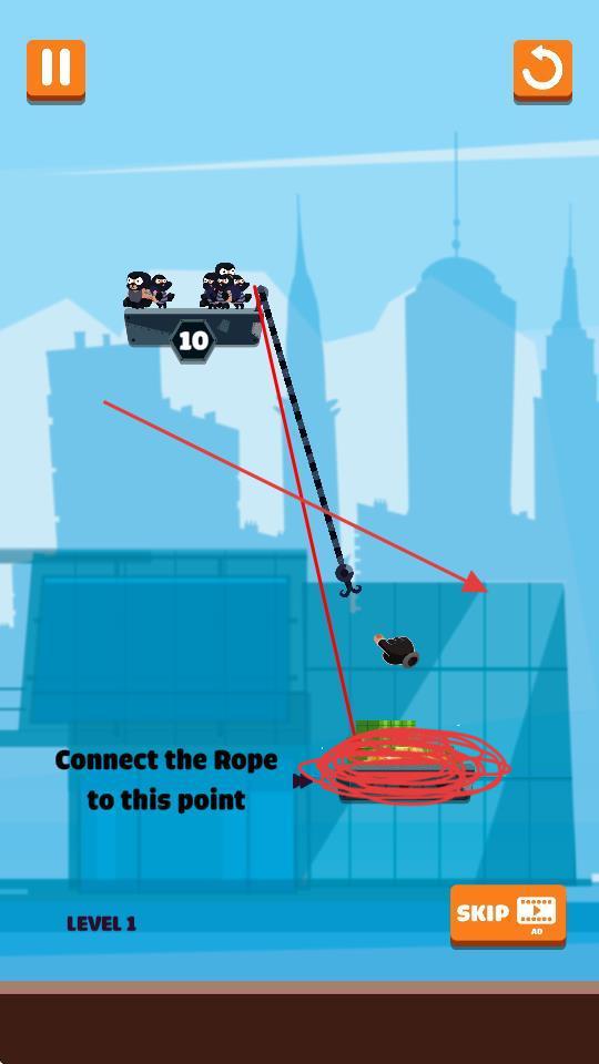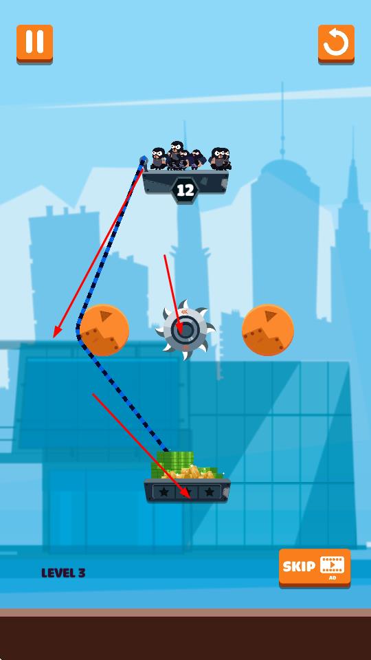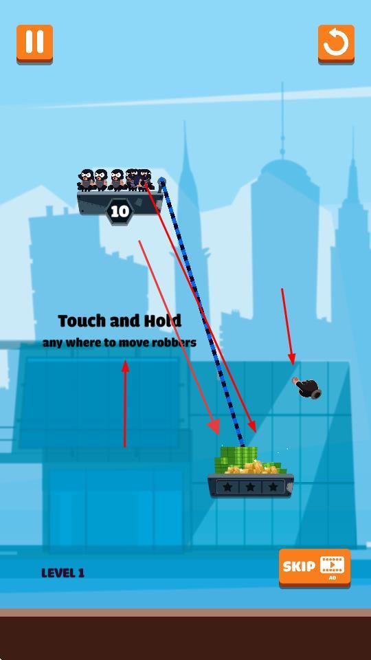 2、长按屏幕,控制强盗队伍沿绳索移动,避开坠落、陷阱,抵达金币箱。