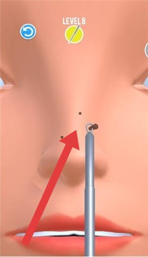 3、LEVEL8中,跟随箭头操作,使用镊子清理客户鼻子黑头,细致完成清洁,推进美妆服务进度。