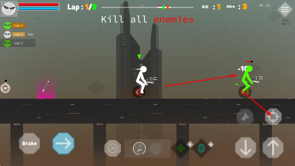 2、在赛道遭遇敌人,点击射击按键攻击,完成“Killallenemies”目标,淘汰对手,提升存活数。