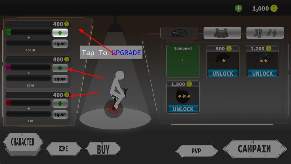 3、用战斗获得金币,在升级界面提升角色属性,解锁头盔、护甲等装备,增强战力,备战后续关卡。