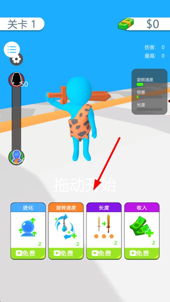 1、进入游戏关卡,点击“拖动开始”,操控角色左右移动,收集赛道上的蓝色小剑,开启武器扩充之旅。