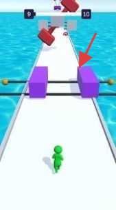 2、跑酷时躲避紫色障碍与下落锤子,规避危险。