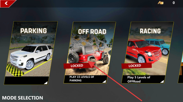 2、在模式选择页,优先玩【PARKING】模式,完成15关停车任务,可解锁【OFF ROAD】等其他模式。
