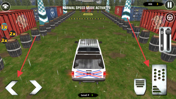 3、驾驶时,用左右箭头控制方向,右侧按键操作油门刹车,按提示在场地行驶,完成Level#1挑战。