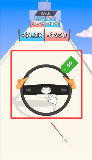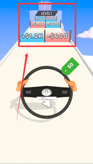1、操控方向盘闯关,玩家通过左右滑动屏幕控制方向盘移动方向,避开障碍物收集金币和道具,顺利到达关卡终点获得方向盘价值奖励。