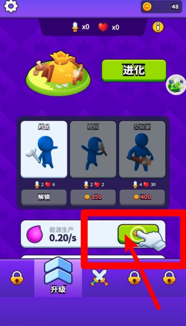 2.点击右下角绿色按钮可提升能源产出速度,加快解锁角色与升级单位所需的能量累积效率。