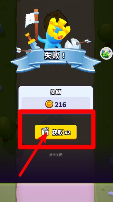 3.战斗失败后仍可获得金币奖励,点击“获取x2”按钮观看广告视频,即可双倍领取当前金币收益资源。