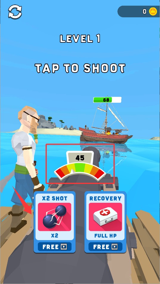 2、观察右侧力度条调整炮弹发射强度,结合风向和距离预判弹道轨迹,确保炮弹能精准命中敌方船只。