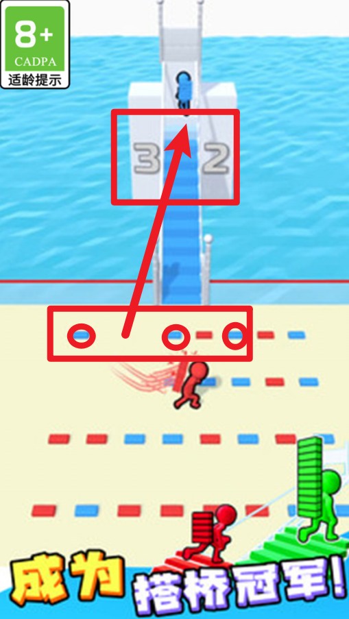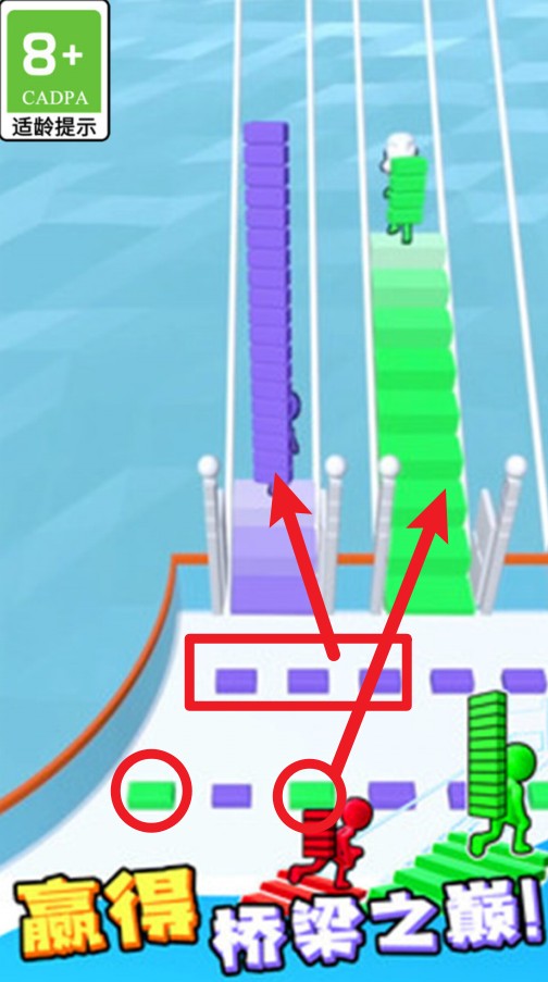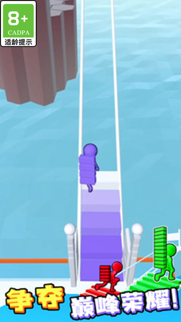2.玩家通过收集绿色和紫色的积木,迅速建造桥梁,并确保自己的桥梁足够稳固,不被其他竞争者赶超。