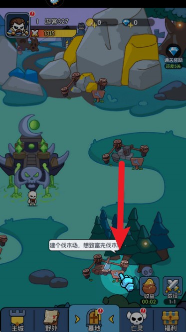 2.根据引导点击树林建造伐木场,获取源源不断的木材资源,为城堡扩张提供重要保障。